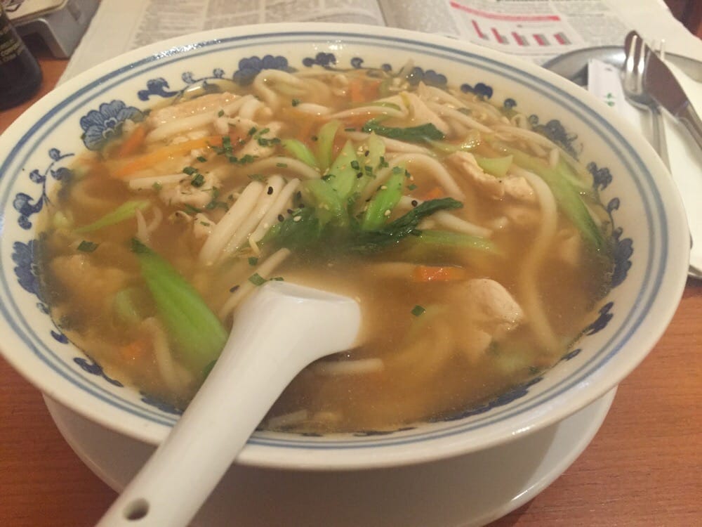Wan Tan Suppe ist eine chinesische Nudelsuppe mit Wan Tan-Teigtaschen gefüllt mit Schweinefleisch, die in einer klaren Brühe aus Hühner- oder Gemüsebrühe, Frühlingszwiebeln, Karotten, Pilzen und Bambussprossen gekocht wird